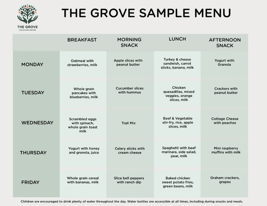 The menu at The Grove has been thoughtfully curated to ensure children receive the essential nutrients needed for both mental and physical growth. We believe in the power of wholesome, made-from-scratch meals, prepared with care and passion. Every dish is crafted using high-quality, fresh ingredients to fuel young minds and bodies, supporting their energy levels, focus, and overall well-being. Our meals are not only nutritious but also designed to introduce children to a variety of flavors and healthy eating habits, setting the foundation for a lifetime of good nutrition. With each meal, we aim to provide a balanced approach to nutrition, offering a mix of proteins, fruits, vegetables, whole grains, and healthy fats to keep children energized and engaged throughout the day.